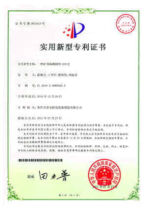 礦用LED隔爆型巷道圓燈專(zhuān)利證書(shū)