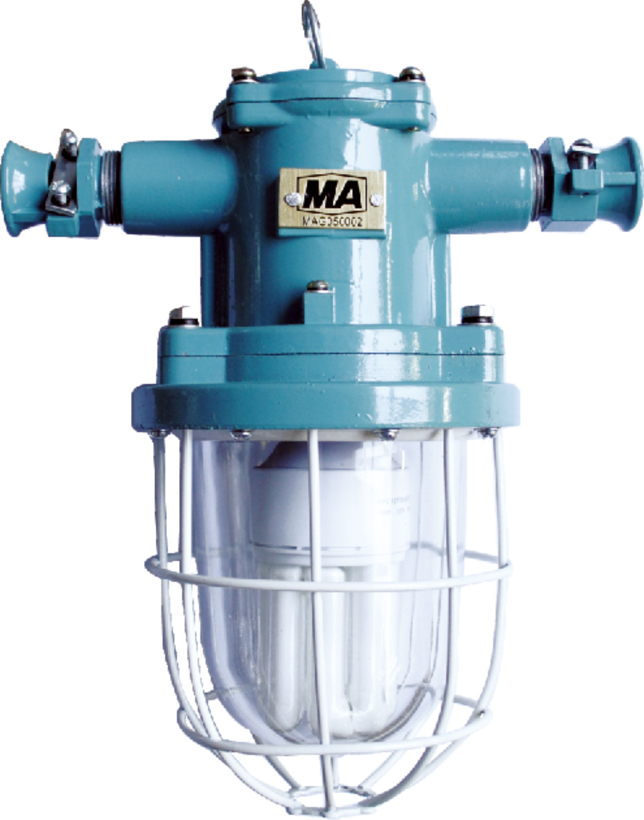 | 13W熒光燈由上蓋、上殼體、下殼體、防爆透明玻璃罩、金屬保護(hù)網(wǎng)等組成,上蓋與上殼體用M4螺釘連接,下殼體用M6螺釘與上殼體相連。防爆透明玻璃罩、護(hù)罩用M4螺釘固定在下殼體上。上殼體外有M4外接地螺釘、銘牌等,上殼體內(nèi)有接線板、M4內(nèi)接地螺釘、直口式壓接燈頭。下殼內(nèi)有密封墊、防爆透明玻璃罩及金屬保護(hù)網(wǎng),燈頭與電源采用直口式壓接方式。上蓋、上殼體、下殼體、防爆透明玻璃罩之間均有符合規(guī)定的隔爆接合面隔爆。 |